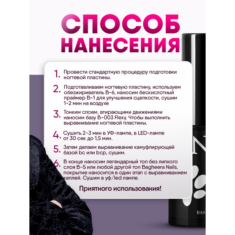 Провести стандартную процедуру подготовки ногтевой пластины. Нанести PH BOND, бескислотный праймер на свободный край ногтя, сушить 1-2мин на воздухе. Тонким слоем нанести подложку из базы В-003. Просушить в в ССFL/LED-лампе от 30 сек до 1 мин . Нанесите камуфлирующую базу с выравниванием, создавая апекс в стрессовой зоне. Сушить в ССFL/LED-лампе от 30 сек до 1 мин. При необходимости снять липкий слой.