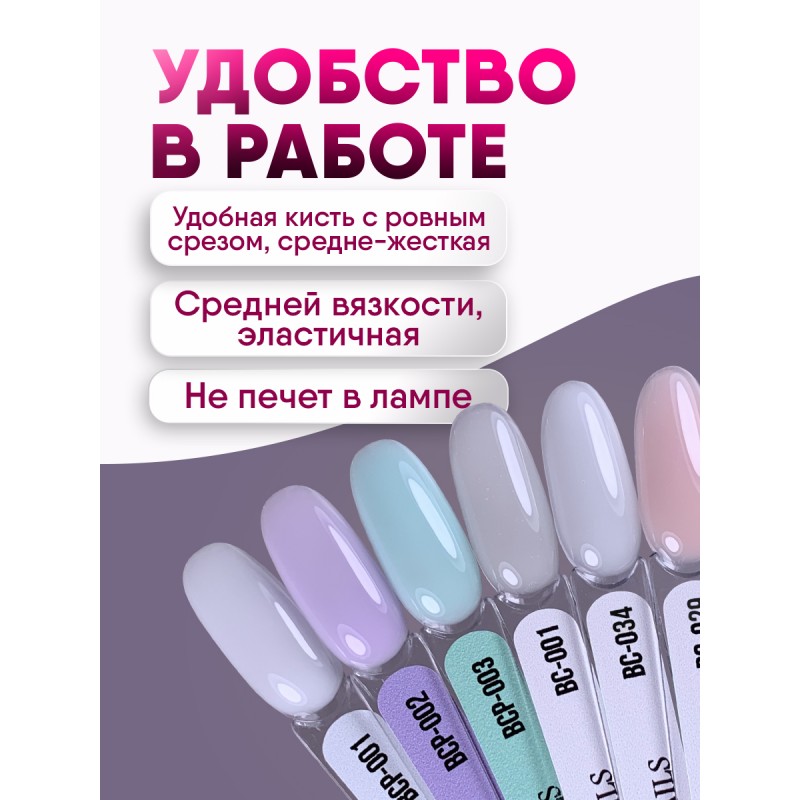 Комфортная консистенция позволяет с легкостью создать идеальные блики. Самовыравнивается, благодаря чему маскирует все неровности ногтевой пластины, сокращает время работы мастера. Обладает высокой эластичностью и устойчива к скалыванию.
