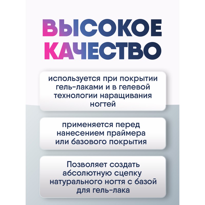 Безкислотный праймер для гель-лака, позволяет создать абсолютную сцепку натурального ногтя с базой для гель-лака. На полностью подготовленную ногтевую пластину нанести праймер не попадая на кутикулу и боковые валики. Ждем 1 мин и наносим базу.