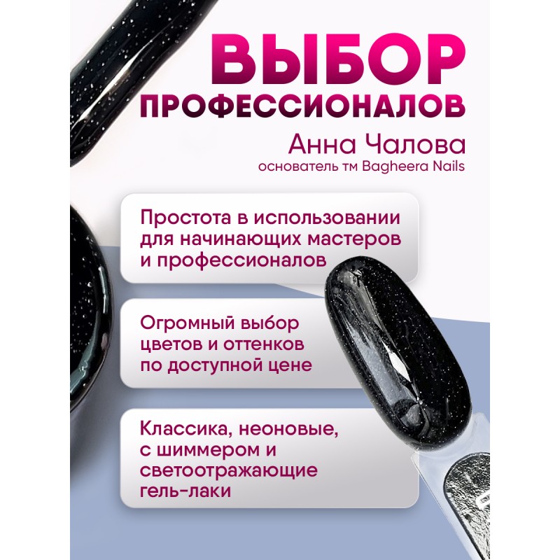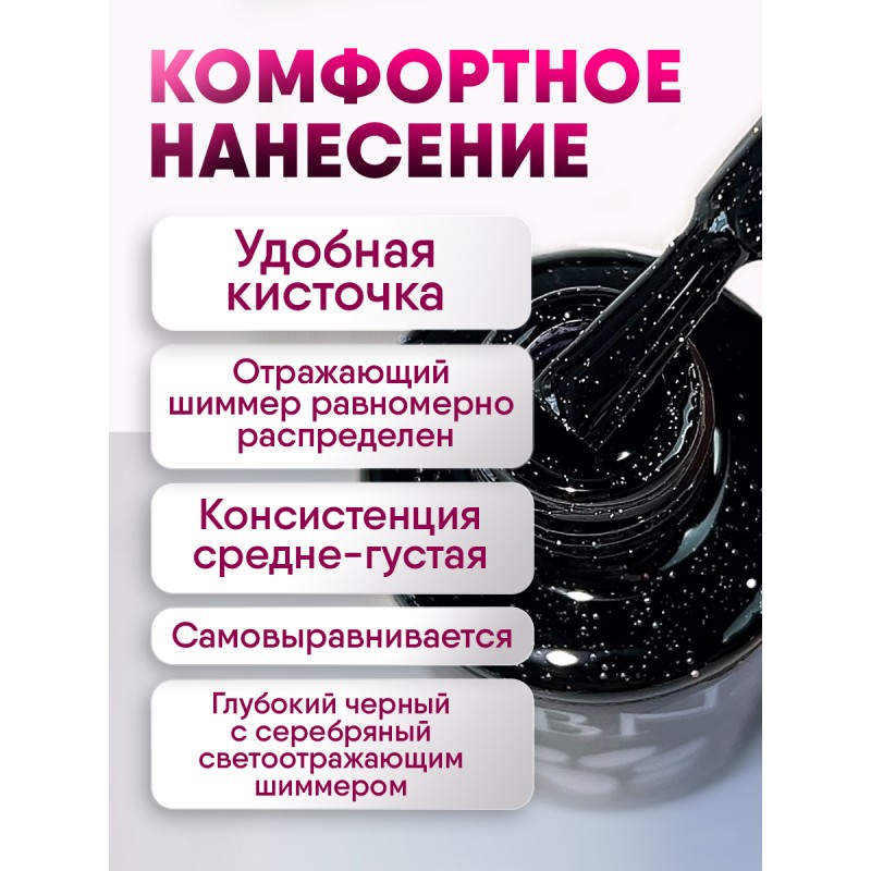 Высокопигментированный, светоотражающий густой гель-лак, наносятся в один слой. Цвет не полосит при нанесении и не съеживается во время сушки. Нанесение в один слой.