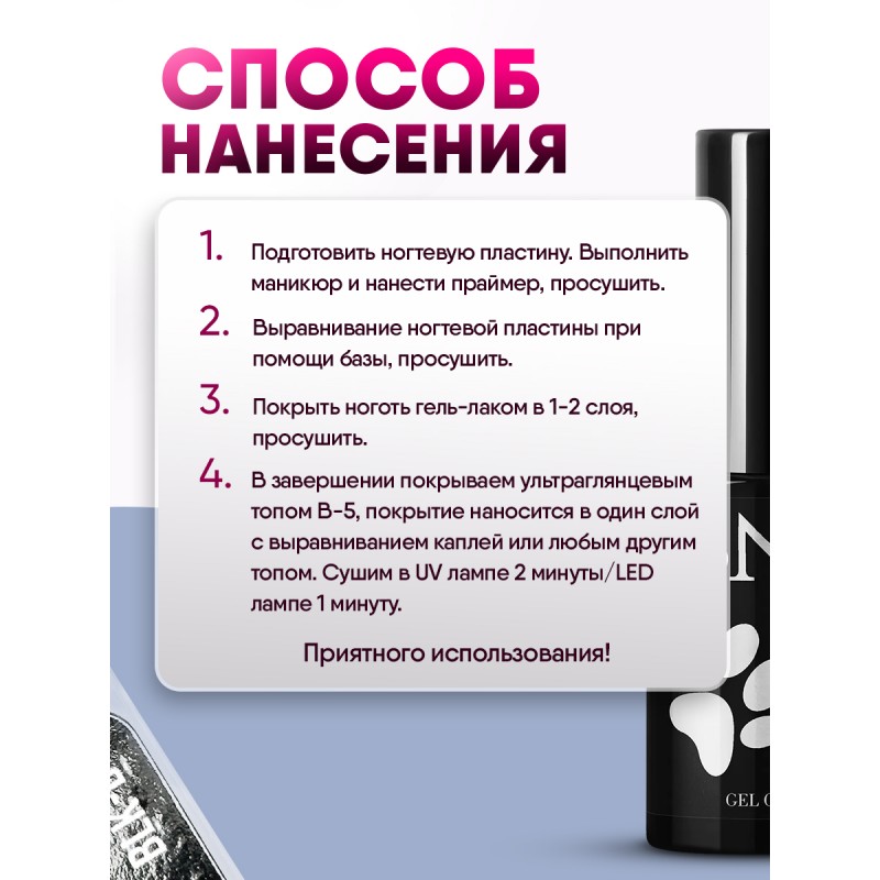 Нанести на базовое покрытие, при необходимости с высоко кислотной базы снять липкий слой. Полимеризация в LED- лампе 1 мин. После нанести топ для гель-лака.