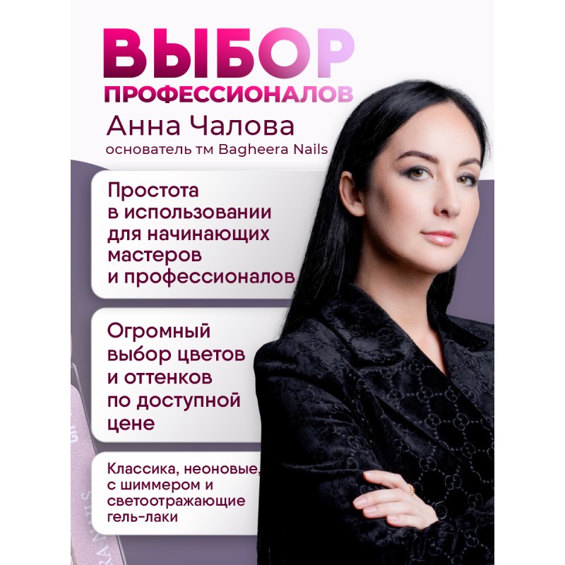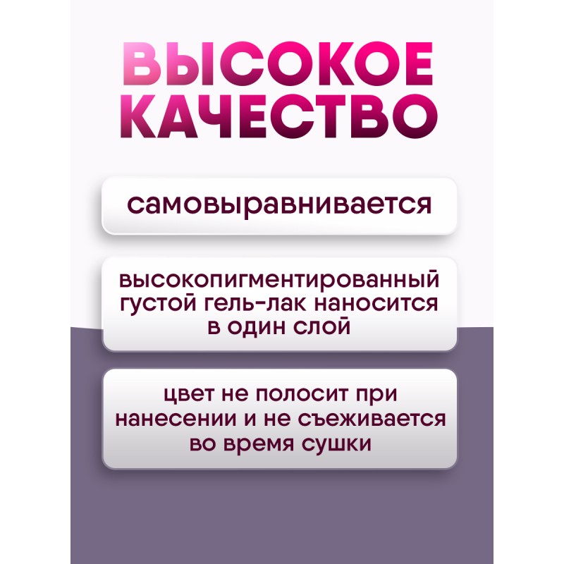 Высокопигментированный густой гель-лак, наносятся в один слой. Цвет не полосит при нанесении и не съеживается во время сушки. Таким гель-лаком работать одно удовольствие.