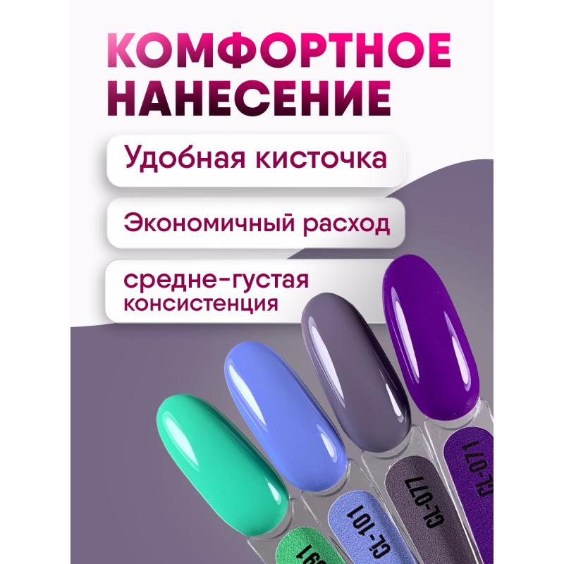 Высокопигментированный густой гель-лак, наносятся в один слой. Цвет не полосит при нанесении и не съеживается во время сушки. Таким гель-лаком работать одно удовольствие.